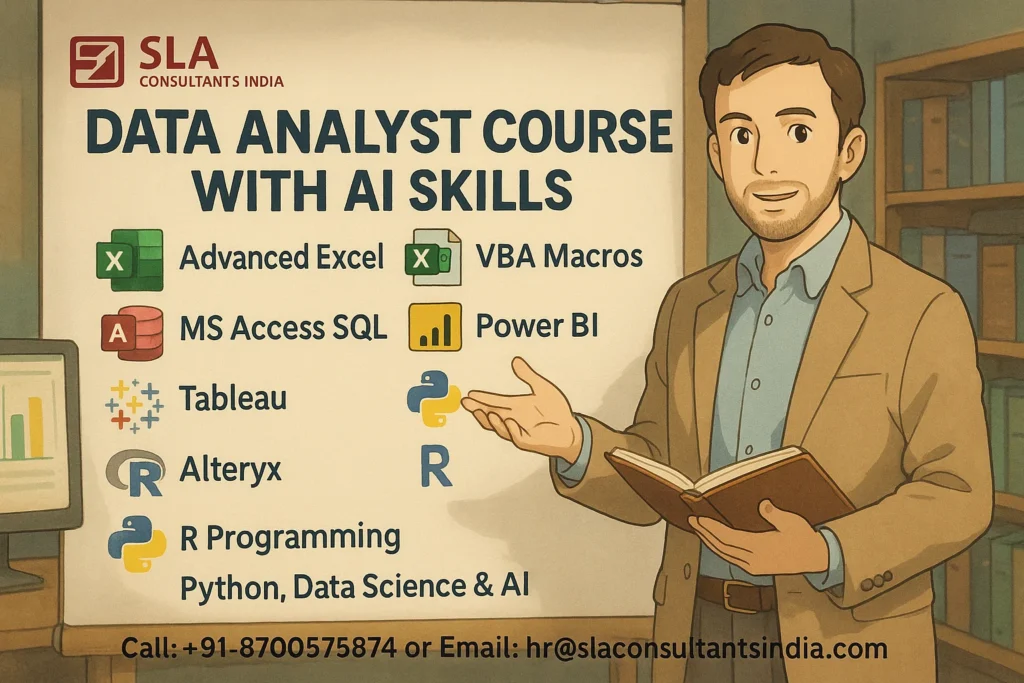 SLA Consultants Delhi offers a Certified Data Analytics Course Online, designed as a job-oriented program updated with AI skills for 2026. This comprehensive course is ideal for freshers and working professionals aiming to build expertise in data analytics with a focus on real-world applications. The curriculum covers core data tools and techniques such as Advanced Excel, VBA, SQL, Python, R programming, Tableau, Power BI, and Alteryx, enhanced with AI-driven modules including predictive analytics, machine learning, and automation to meet evolving industry demands.